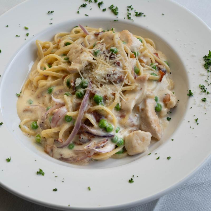 Chicken breast tossed with spaghetti in a velvety, creamy white wine sauce with green peas, onion, and the savory flavor of bacon and garlic.