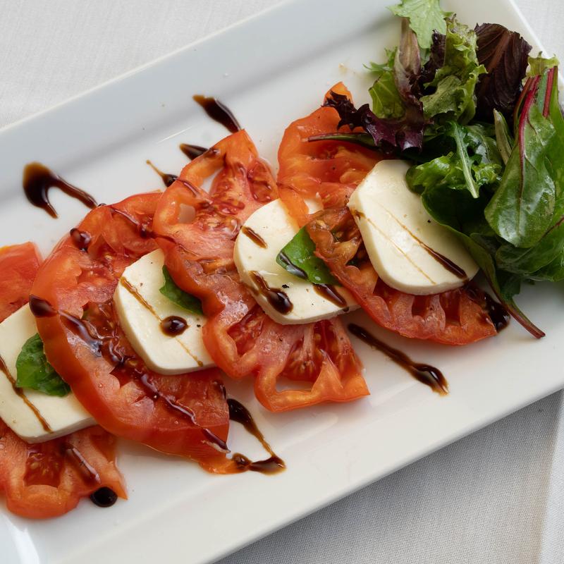 Creamy and delicate fresh mozzarella ball paired with juicy, sliced tomatoes, fresh basil leaves, and topped with a balsamic glaze.