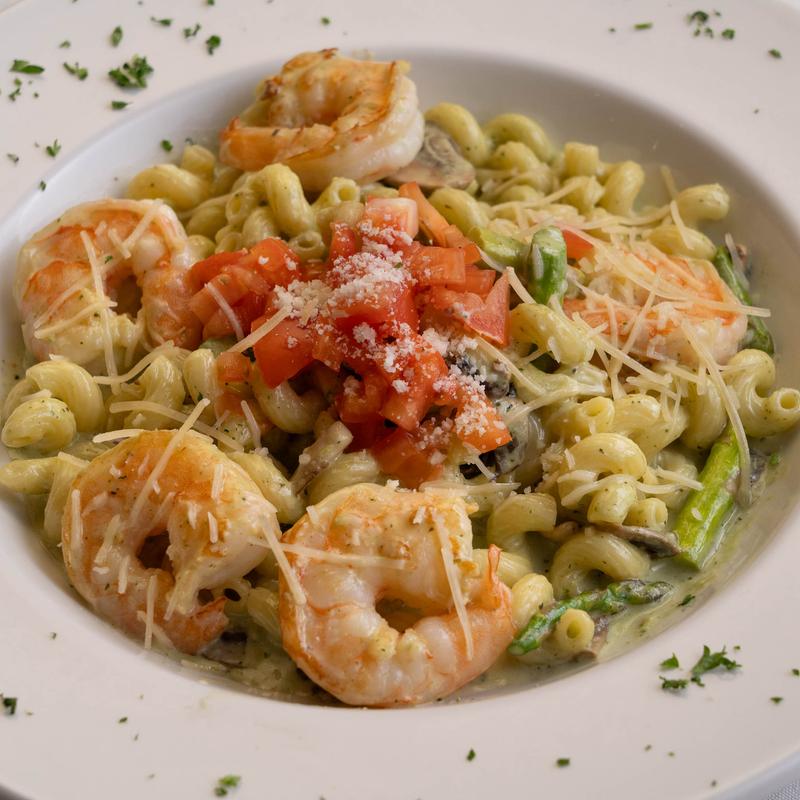 Jumbo shrimp with cavatappi noodles combined with a basil pesto sauce, fresh mushrooms, tomatoes, and asparagus.