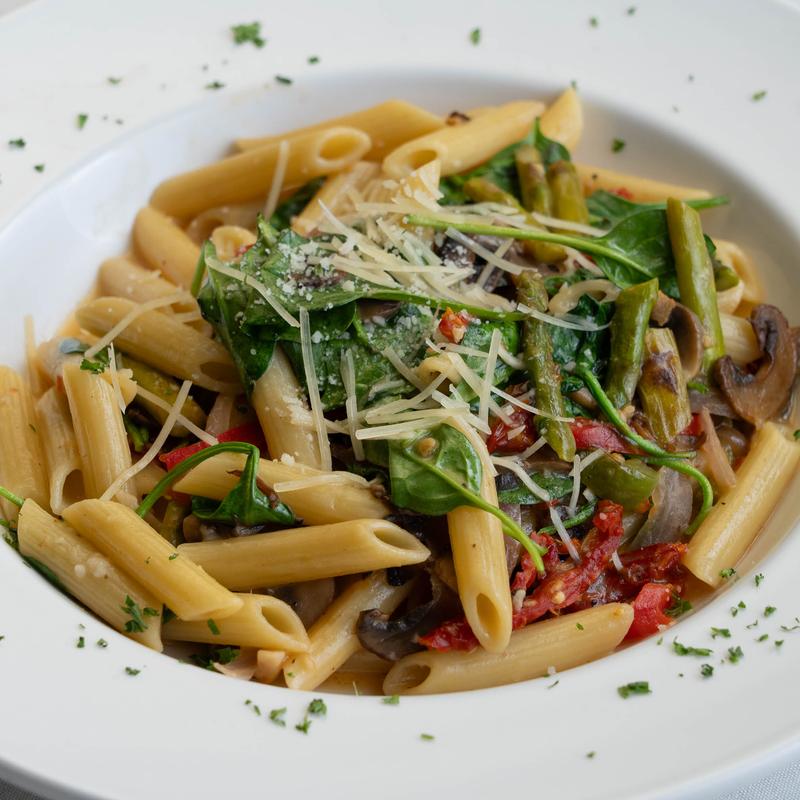 Penne pasta tossed with a medley of sun-dried tomatoes, mushrooms, spinach, onions, tomatoes, bell peppers, and asparagus. Finished in a garlic and olive oil sauce with a hint of white wine and shaved Parmesan.