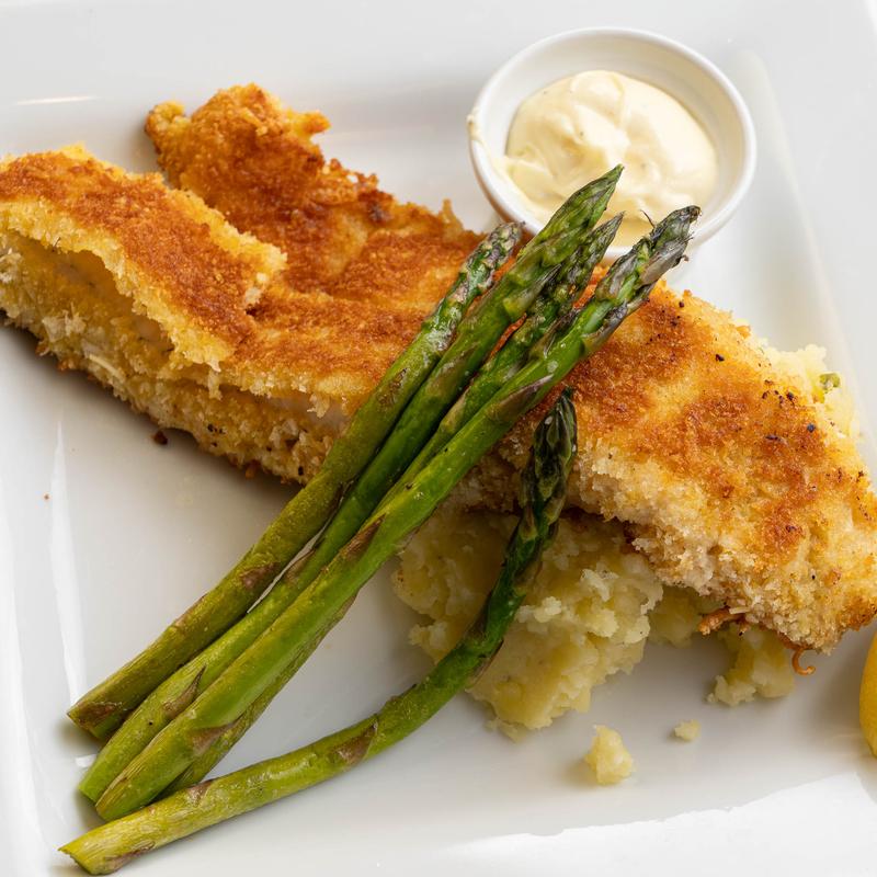 Walleye fillet coated in a crispy panko and parmesan crust, served with a delicate lemon aioli sauce, mashed potatoes, and asparagus.